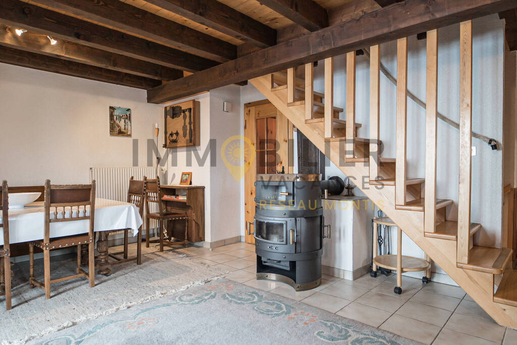 Rez : Séjour lumineux orienté sud/sud-ouest avec accès au balcon. Salle à manger avec banc d'angle, poêle suédois (bois non fourni. En vente au supermarché du village). Cuisine ouverte équipée de lave-vaisselle, plaques vitrocéramiques. Réduit avec frigo d'appoint. WC, lavabo.