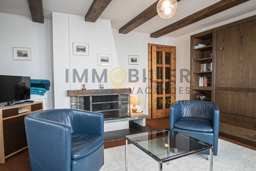 Distribution : Hall d'entrée avec penderie et placards. Séjour spacieux avec cheminée ouverte (bois non fourni. En vente au supermarché du village), TV câblée, accès au balcon, 2 lits rabattables. Cuisine séparée avec micro-ondes et coin à manger, accès au balcon. 2 chambres, une avec 2 lits individuels côte à côte et une avec 2 lits superposés. Salle de bain avec baignoire, WC et lavabo. Ascenseur dans la résidence.