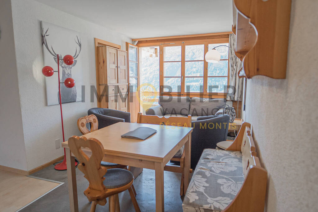 Charmant appartement 2.5 pièces pour 2 à 4 personnes, fraichement rénové, au 1er étage de la Résidence Plein Soleil avec balcon et belle vue panoramique. Proximité de toutes commodités, à 5 minutes à pied du centre du village et à 2 pas de l’arrêt du bus-navette (en hiver) « La Poste ». Cuisine avec four, lave-vaisselle et micro-ondes. Salle à manger avec une jolie table en bois et radio. Salle de bain avec baignoire, WC et lavabo. Salon avec 1 canapé lit double et 1 lit superposé double, TV à écran plat. Une chambre avec un lit double. Machine à laver et séchoir dans la buanderie commune. Local à ski également à disposition. Place de parc devant l'immeuble (dans la limite des disponibilités). Animaux non admis.